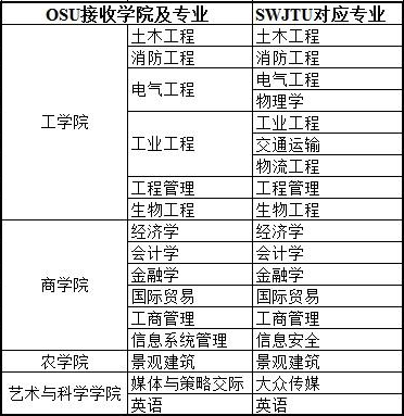 选拔我校相关专业大一、大二在读本科生(含峨眉校区)于2014年8月前往OSU进行一学期的交流学习。学生正常缴纳西南交大学费和OSU学费,在美期间的生活费、住宿费、往返机票等均由学生自理(一学期总费用约10万元人民币)。学生在美期间修读的学分我校全部承认并按照西南交大本科交换生学分认定办法进行转换认定。