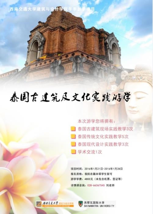 建筑与设计学院学生境外留学(游学)计划,现将2015-2016学年度寒假短期赴泰王国西那瓦大学(古建筑及文化实践)游学项目申请及费用安排公布如下(详见附件),欢迎各位同学积极参与。项目联系方式028-66367545 刘老师。