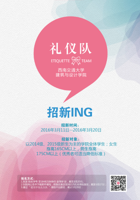3月11日——3月20日,通过建筑与设计学院礼仪队后台报名。