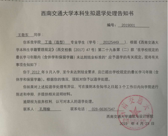 《关于拟对王敬东同学作出退学处理的告知书》已于2019年4月19日发至学院,因学院无法与本人取得联系,用其他方式也无法将其送达,现将《关于拟对王敬东同学作出退学处理的告知书》予以公告。自本公告发出之日起满15个工作日,视为送达。