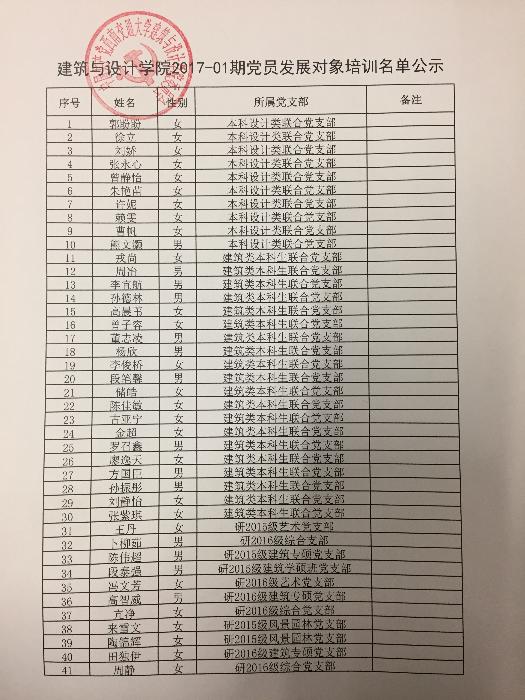 经各基层党支部推荐,学院党委审查,拟推荐以下41名同学作为2017-01期党员发展对象参加党课培训,具体名单见附件。 现进行公示,公示期为2017年3月29日—3月31日。如有异议,请致电66367505,或到学院X8232办公室反映,恕不接受匿名电话和信件。