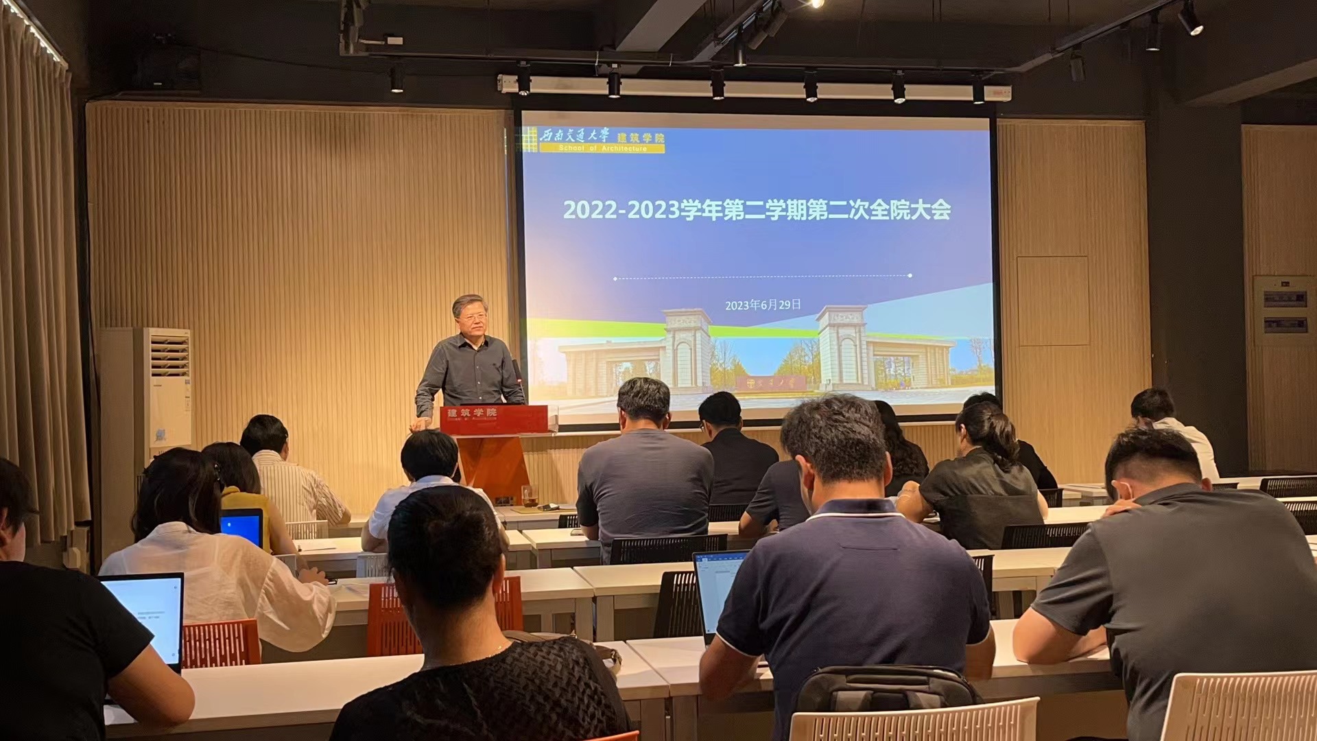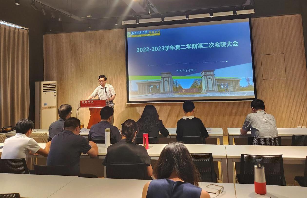 在犀浦校区8号教学楼A100报告厅召开了2022-2023学年第二学期第二次全院教职工大会,开展师德师风专题教育,并回顾总结本学期工作,部署安排近期工作。执行院长沈中伟,党委副书记刘一杰,副院长崔叙、杨青娟,学院助理刘春尧、张樱子、付飞、于洋等学院领导,以及学院全体教职工参加了此次会议。会议由学院党委书记胡伟主持。