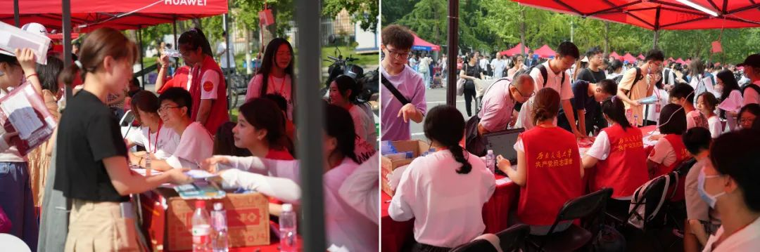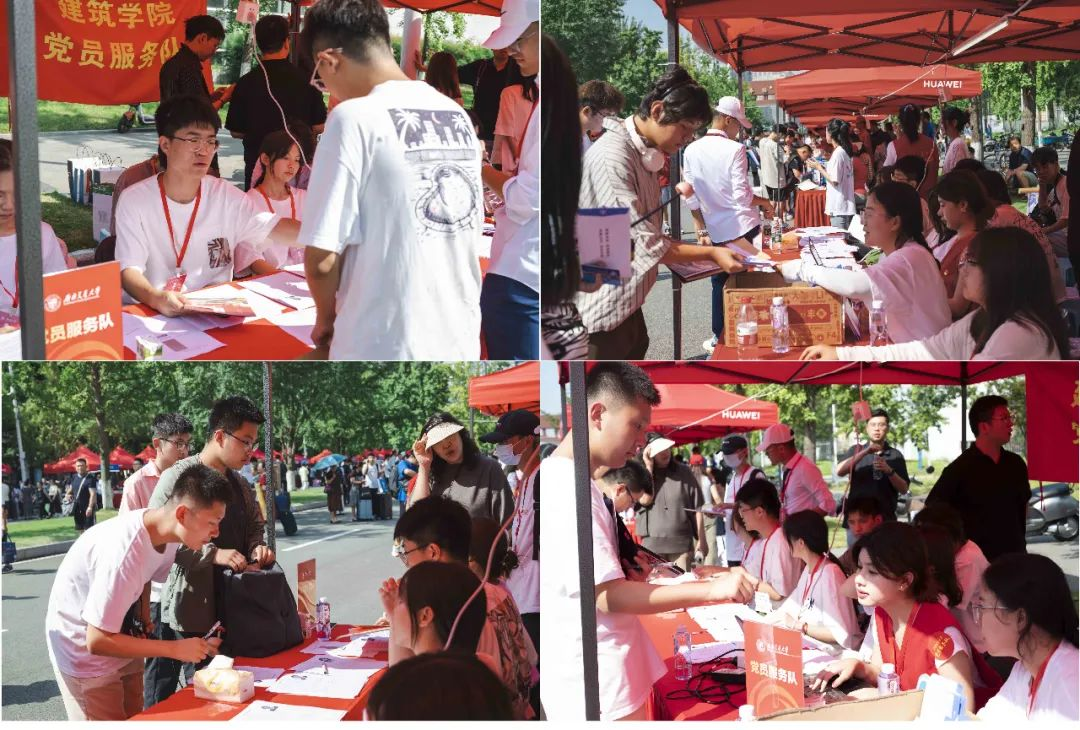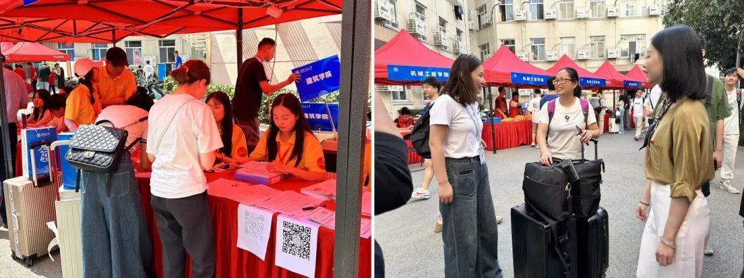 迎新手续办理点,进行资格审查、录取通知书提交、身份核验、党团关系转接等事宜,领取新生大礼包后由迎新志愿者和班协指引,步行或乘坐校内交通车至宿舍。各个环节紧紧相扣,开展顺利,有条不紊。