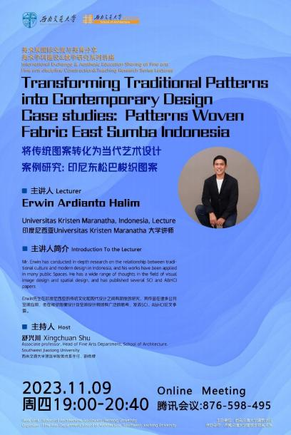 美术系国际艺术交流与美育分享活动、美术学科建设&教学研究系列讲座“将传统图案转化为当代艺术设计——案例研究:印尼东松巴梭纺织图案”,在印度尼西亚Universitas Kristen Maranatha大学的讲师Erwin Ardianto Halim充满热情的讲中拉开帷幕。此次讲座以线上分享的形式在腾讯会议展开,由卡通a片
