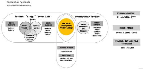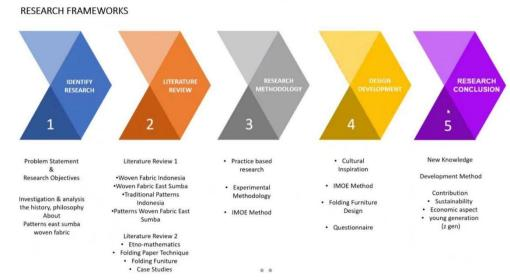 在确定研究方向后,Erwin Ardianto Halim进行了大量的文献阅读,其中包括传统纹样、折叠切割技术、IMOE研究方法等众多领域。由此得出结论:1、东方松巴梭织织物的图案对于松巴部落具有神圣的意义。2、当地与传统文化是创意灵感的重要源泉,这将会为产品提供附加价值。3、设计师需要分析当地文化与当代产品设计。4、在对图案和本土文化作为当代产品设计灵感的众多研究中,仍然缺乏帮助设计师将文化特征转化为当代产品,进一步提升其价值的研究。而这项研究在将IMOE方法发展成为全球设计师和设计教育不可或缺的工具方面发挥了至关重要的作用。