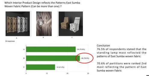 他还向我们展示了使用者的反馈调查:以上三件产品中,哪些室内产品设计体现了东松巴梭织图案(可多选)?其中76.5%的人认为 Kandunnu Standing Lamp最能体现东松巴梭织织物图案,其次是70.6%的人认为Njara Partition最能体现东松巴梭织织物图案,最后则是Wuyarara Chair,占被调查人数的41.2%。