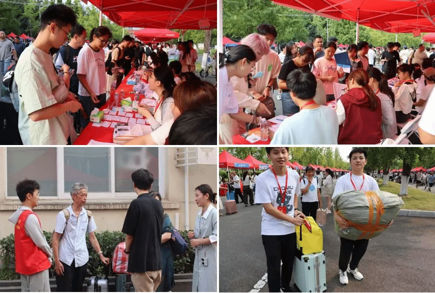 迎新手续办理点,进行资格审查、录取通知书提交、身份核验、党团关系转接等事宜,领取新生大礼包后由迎新志愿者和班协指引,步行或乘坐校内交通车至宿舍。各个环节紧紧相扣,开展顺利,有条不紊。