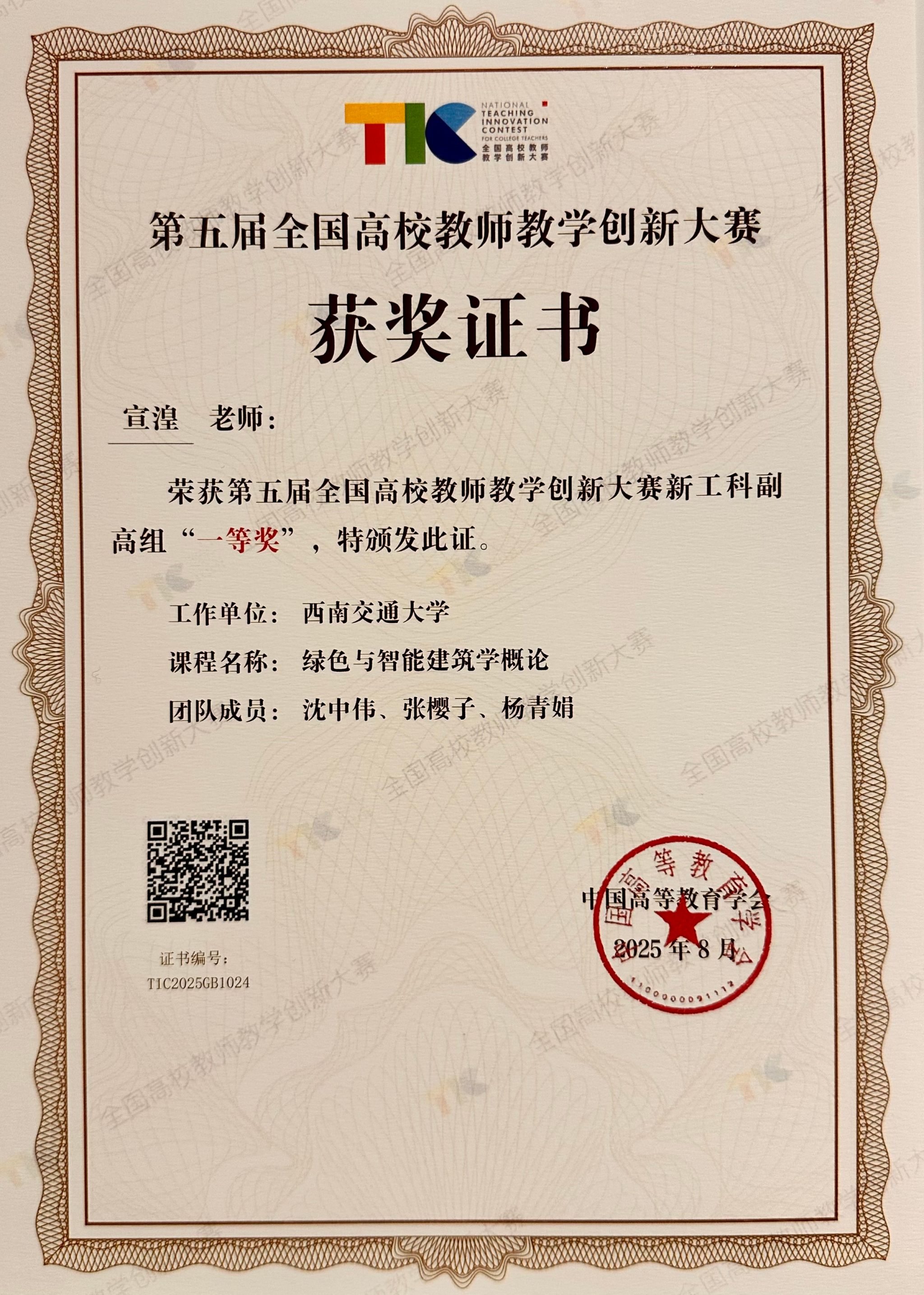 核心课程《绿色与智能建筑学概论》参赛,聚焦绿色与智能技术融合,针对“知识整合难、能力培养难、价值内化难”三大问题,课程创新构建“模块化 + 层级化”教学内容结构,以工程实践问题为主线整合相关理论与实践;教学模式上探索“任务链驱动—多师协同—交叉反馈”三位一体机制,并融合具身认知理论打造“五感驱动”沉浸式教学场景,助力学生实现知识、能力与价值的协同成长。