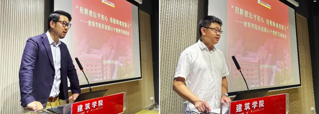 沈中伟院长在讲话中,对获奖教师及学院近年来在教学、科研、人才队伍建设等方面取得的“三丰收”成绩给予了高度肯定。他指出,宣湟、杨林川两位老师不仅是“中国建筑教育界佼佼者”,更是学院精神的体现,他们的奋斗精神是学院的骄傲。沈院长对全体教师提出了三点期望:一是要将个人理想融入祖国发展和学院事业,积极响应国家战略;二是坚守教育初心,做新时代的好老师,引领社会风尚;三是只争朝夕、勇攀高峰,以教育家精神铸魂强师,要向上攀登、向下实践、向前奔跑。沈院长还特别强调了青年教师的发展,勉励他们成功没有捷径唯有奋斗,日积月累、久久为功,淡泊名利、志存高远,守住底线、常怀敬畏之心。同时,他也指出一代人有一代人的使命,希望学院全体教师跑好属于自己的接力棒,老中青团结协作,相互学习借鉴,扬长避短,共同推动学院发展。