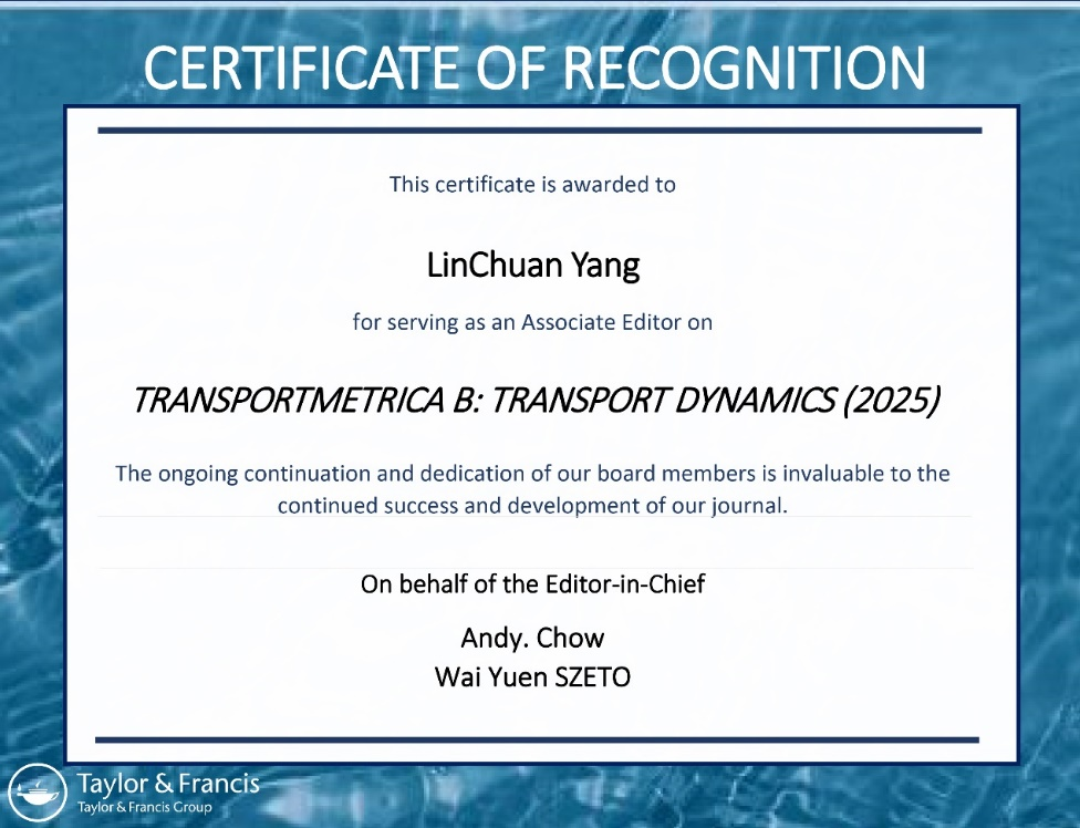 杨林川教授获邀担任高水平国际期刊《Transportmetrica B》副主编(Associate Editor),彰显了其在城市交通与土地利用规划领域的学术影响力。