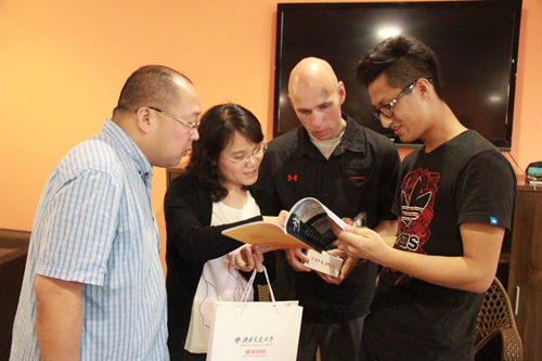 学院党委栗民副书记、王俊老师及学生与Nichoias老师欣赏学院本科生刊物《步行街》