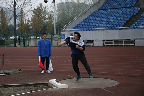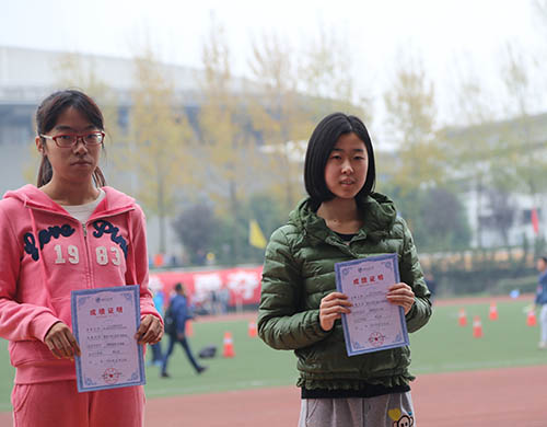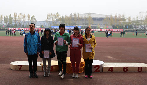 体育部邀请方翰老师为女子跳远获奖选手颁奖