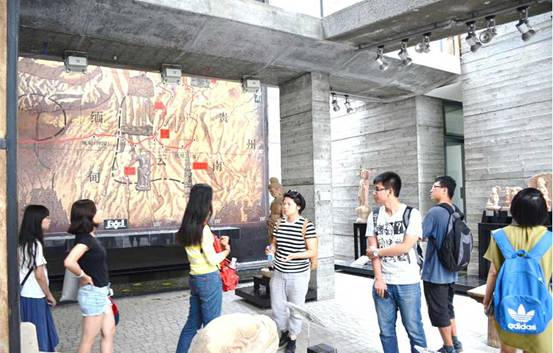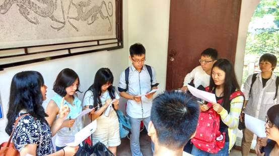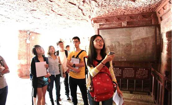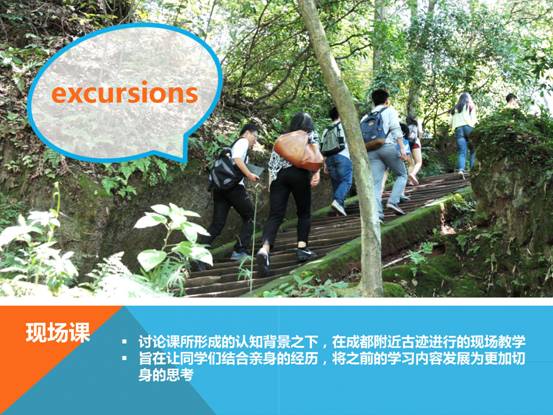 现场课(excursion)环节则是在讨论课所形成的认知背景之下,在成都附近古迹进行的现场教学,旨在让同学们结合亲身的经历,将之前的学习内容发展为更加切身的思考。在每个考察现场,老师先进行简要介绍,并分配任务,让同学们分组调查,然后再回到老师的指引下,进行小组间的交流讨论。