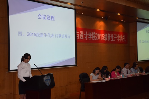 闫梦迪同学代表2015级新生发言,表达了迎新期间学院领导、辅导员,以及各位学长、学姐对新生的关心与帮助。并承诺在今后的学习和生活中树立远大的奋斗目标,勤思好问,笃志博学,提高自己的实践与创新能力。树立规范意识,严于律己,做一名合格的交大人。