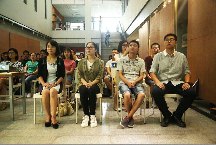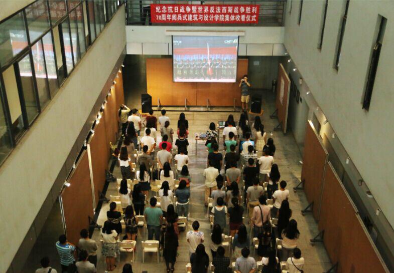 2015年9月3日上午10时,建筑与设计学院师生党员于学院中庭观看纪念抗日战争暨世界反法西斯战争胜利70周年阅兵仪式。当电视大屏幕上传来李克强总理宣布全体起立时,大家迅速站立,与转播的画面一同高唱起国歌,向伟大的祖国致以最崇高的敬意。