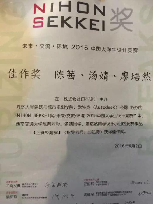 建筑与设计学院刘弘涛老师指导的陈茜、汤婧和廖培然三位同学组成的设计小组荣获佳作奖,史劲松老师指导的宋国晗、仲亮和陈子嘉三位同学获得入围奖。