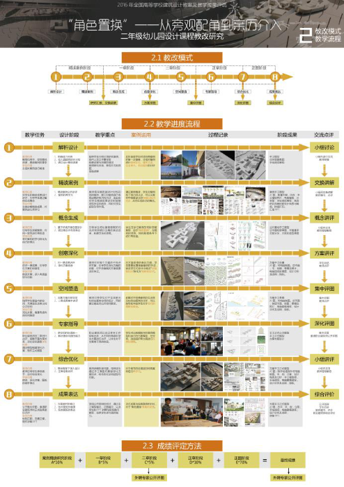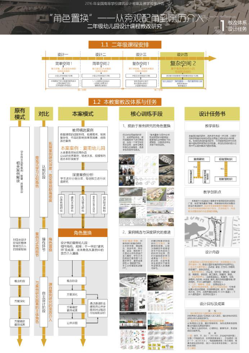 获奖的建筑学二年级根据设计课程的阶段性现状,对案例研究在设计课程中的角色定位进行拓展性改革,延长该研究阶段在教学进程中的时间,大力加强其教学引导和成果的深度和力度,使其与教程进度、学生创作的节奏特点、设计能动性的调动、创新性设计思维的关联性激发等方面,形成实质性推动。根据二年级学生的能力和知识结构的特点,采取“角色置换”等策略,从横向和纵向角度对案例研究与教学过程的整合进行拓展性推动:“角色置换”是指对单一的案例进行深层次的拓展性解读后,将学生自身转变成该案例的设计者,去完成同样的设计题目,看看自己会怎么做,从而激发学生的对比欲望来促进创作进程的推进,通过针对性的选择案例,深度把握案例,建立对案例进行系统诠释的技巧和方式,挖掘什么是讨论和分析的重点问题,以及将这些点进行表达的有效性问题;在二年级最后一个课程幼儿园设计中,选取一个现实中既有艺术创新,又能整合规范、功能、经济等现实条件的优秀作品,将被评为中国年度建筑奖的上海青浦夏雨幼儿园,作为深度研究对象,根据具体设计课题的情况,有效延长案例研究课时,一般为两周,3-4个课时,进行专项的分组独立研究,由教师主导案例研究深度、侧重点和与整个设计课程的整合力度,然后让学生虚拟变成该项目的设计师,总结原项目的场地、指标、功能关系、空间关系,以原有基地、规模相同基本条件进行方案的重新创作与思考,在学习原方案的配置关系下,摆脱原方案的影子进行新的创作思路和角度的挖掘。