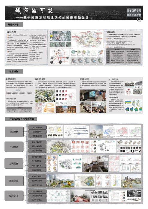 四年级城市设计单元,在设计立场上开始从个体主观喜好过渡到城市社会群体趋向,在设计尺度上从个体空间、群体空间过渡到城市的宏观考量;在设计方法上突出研究型设计的特点,强调调查分析、理论研究与空间设计的结合。课程教学围绕这三个方向展开,并设计相应的教学过程,强化技术手段的辅助,以建立学生对建筑与城市、行为与空间、社会与文化、效率与公平等一系列问题的初步认知。