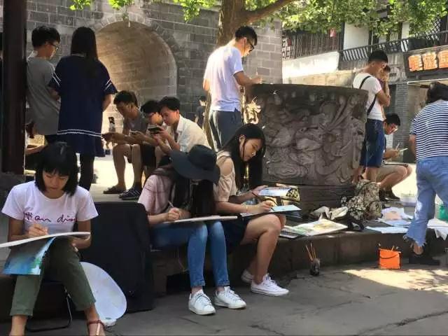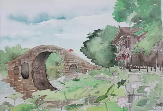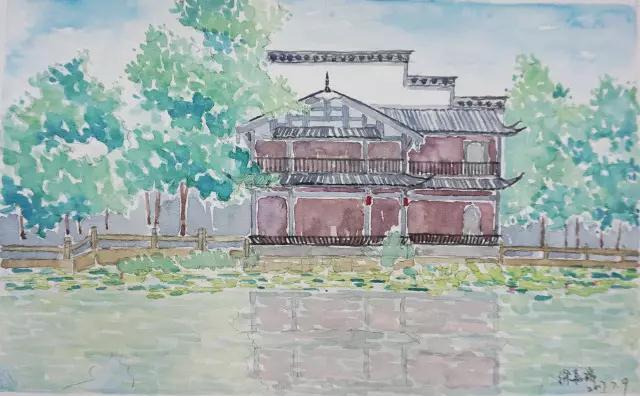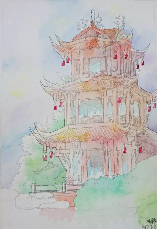 “水彩实习”这门课程是西南交大建筑与设计学院建筑学、城市规划、风景园林专业大二暑期的实习课程,在经过了半学期的课堂写生学习后,大家逐渐过渡到优美的户外风景写生中来。我国的建筑学科教育体系,也是参照西方教育体系设置的,50年代以来的建筑设计类专业,都必须系统地学习绘画,素描和水彩画是必修科目,有些学院甚至把美术作为考核学生是否适合学习建筑设计的前提。著名建筑大师杨廷宝、梁思成、齐康,无一不是技法娴熟的水彩画家。当然,作为建筑师、规划师,扎实的美学功底是成为出色设计师必不可少的先决条件,它包含建筑寓意、构图、形体、对比、色彩、空间等因素。