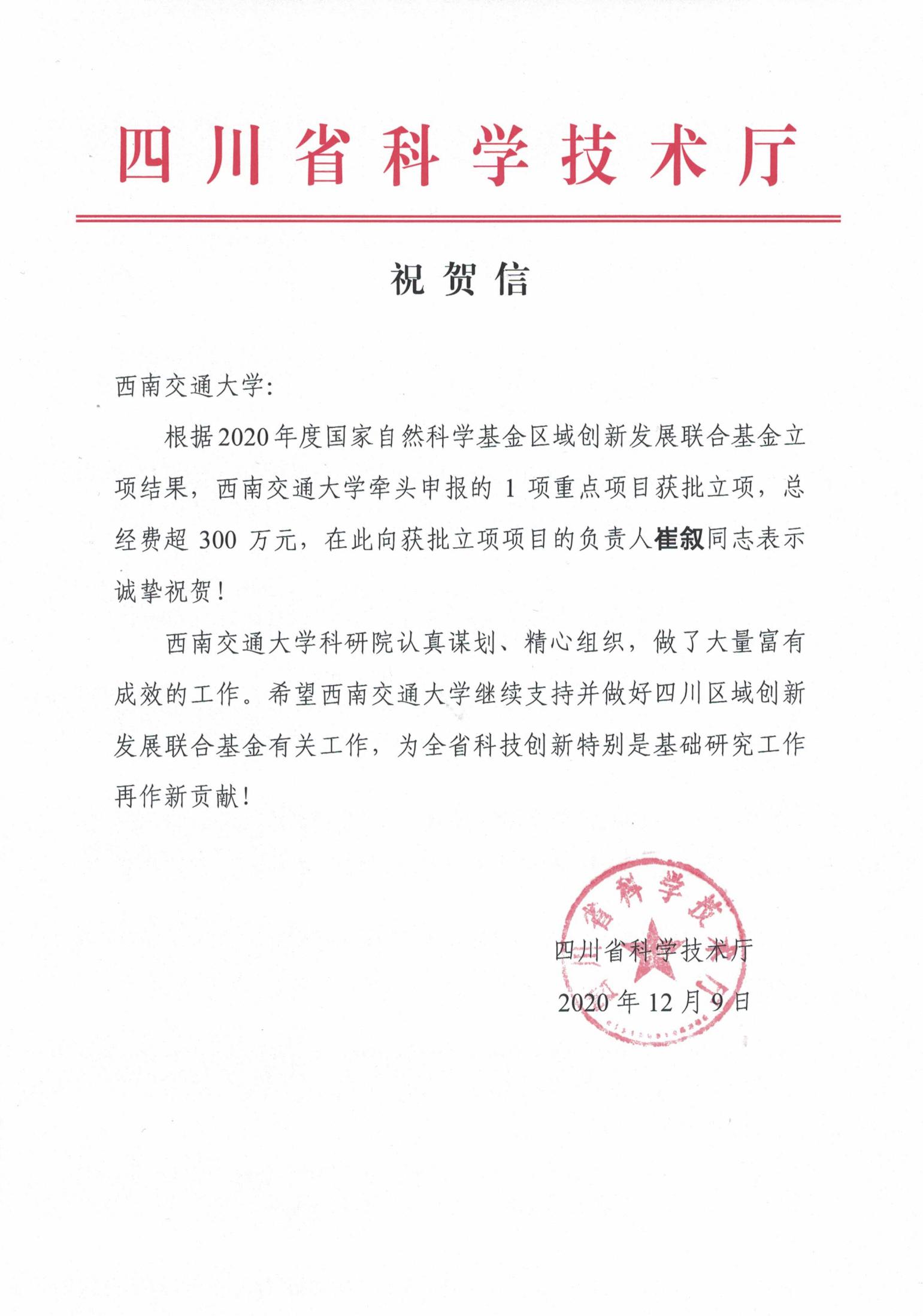 根据国家自然科学基金委员会和四川省科技厅通知,卡通a片 崔叙教授主持的“交通综合体与城市关联效应及效能优化方法研究”获批国家自然科学基金区域创新发展联合基金重点项目,实现了卡通a片 国家自然科学基金重点项目的突破。
