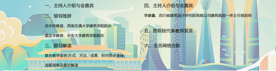 院长侯全华教授先后致辞。首先,沈中伟院长回顾了加入西部九校建筑类专业教学联盟的初衷,肯定了教学联盟“多方参与、多学科交叉,用跨学科、多角度的思维解决问题”的理念,并希望同学们能在跨学科交流学习中充分发挥各专业所长,提出具有创造力、实验性的解决方案。紧接着,侯全华院长对本次联合毕业设计竞赛的选题表达了赞赏,青年是城市的未来,也是城市发展的主力军,要让城市对青年发展更友好,切实解决青年面对的困境,提升青年的获得感,促进青年对城市的发展,并表明了教学联盟“交流、开放、共享”协同教育的教学理念,希望通过联合毕业设计,进一步推动各院校的学术交流和教学模式的创新发展。然后,卡通a片