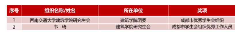 研究生会荣获“2021年度成都市优秀学生会组织”荣誉称号,研究生会主席团成员韦琦同学荣获“2021年度成都市学生会组织优秀工作人员”荣誉称号。这既是对卡通a片