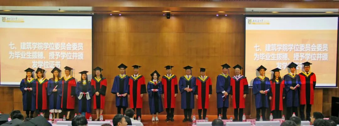 在高亢的音乐声中,学院学位评定分委会委员为毕业生拨穗、授予学位,并合影留念,将典礼的气氛推向高潮。