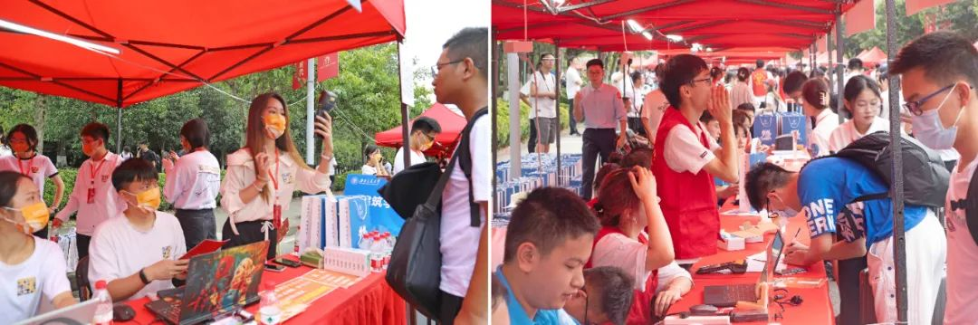迎新手续办理点。领取新生大礼包后由迎新志愿者和班协指引,步行或乘坐校内交通车至宿舍。