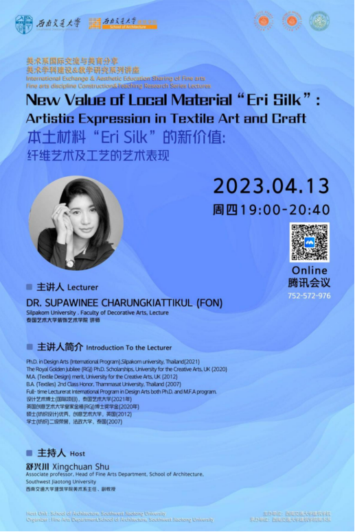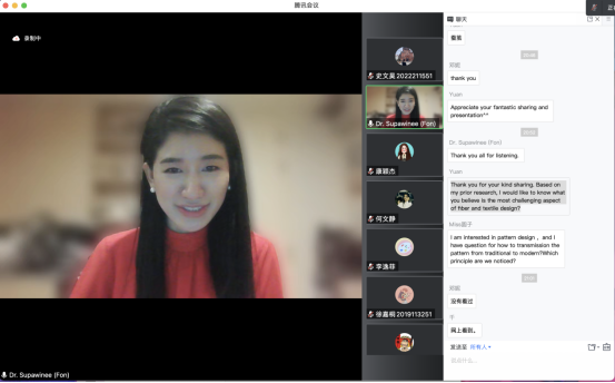 美术系国际艺术交流与美育分享活动、美术学科建设和教学研究系列讲座“本土材料‘Eri Silk’的新价值:纤维艺术及工艺的艺术表现”,在泰国艺术大学装饰艺术学院讲师DR.Supawinee Charungkiattikul(Fon)博士的精彩分享中拉开帷幕。此次讲座采用腾讯会议的形式线上开展,由卡通a片