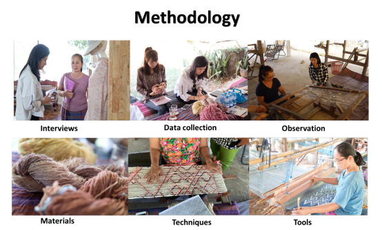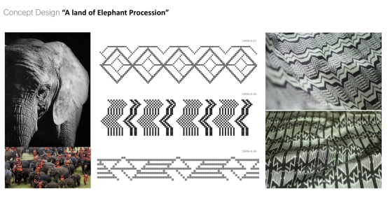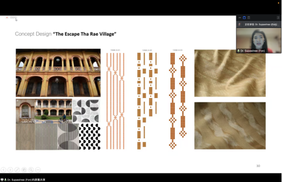 Dr.Supawinee Charungkiattkul向我们展示了她以美术创作者的角度参与的泰国当地社区的纺织项目,这些纺织品可以被用来制作衣物、手套、帽子等。她的工作主要集中在图案设计上,从图案的选择到最终作品的完成,都是她与团队合作完成。她介绍说,图案的选择和图案的设计是一件很重要的工作, Charungkiattkul说:“我一直在寻找灵感,我发现这是一种非常有趣的艺术表达方式。我还发现,将图案应用于纺织工艺是一件很有趣的事,因为我们可以从这件作品中学习到很多知识。”她与我们分享了她与团队合作完成作品时所采用的一些技巧,比如从泰国传统建筑、动物的皮肤纹理以及天然纤维的形态中提取出基础图形,再将它经过重新排列,组合成最终的图案。