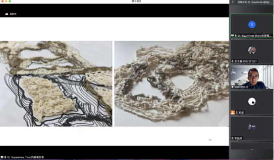 在讲座的最后,Dr.Supawinee通过她的纤维艺术作品向我们展示了泰国当代纺织艺术和工艺美学知识,并诠释了泰国本土材料“Eri Silk”的新价值。在提问环节,老师对于同学们所提出的“传统丝织材料和Eri Silk材料有哪些不同?”“在以后的创作中有可能用到如今的人造纤维材料或者化学材料呢?”“从可持续角度考虑,Eri Silk材料可否加入再生纺线,比如一些被遗弃的纺织品再加工,为环保做贡献呢?”等问题都做了十分详细的解答。