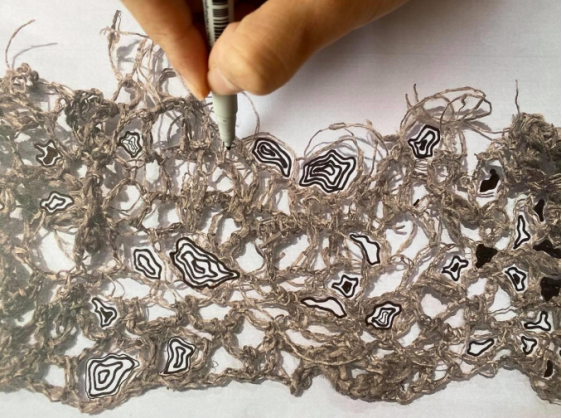 她分享了她的设计过程,设计灵感来源于地图上的等高线,并结合了Eri Silk这种天然纤维材料的肌理效果进行创作,同时她还探索了大自然中其他纤维纹理的图案,比如透明的昆虫翅膀、蜘蛛网、卷曲的叶子等。她扑捉到了这种天然的美,创作了一些独特、有表现力、富有创意的纺织品图案,这些作品也展示了纺织工艺和艺术之间独特而微妙的关系。