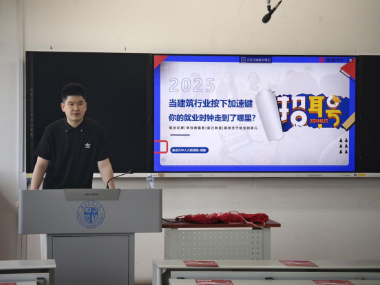 于2025年5月8日下午,在八号教学楼8535教室举办了“当建筑行业按下加速键,你的就业时钟调到了哪里”就业指导讲座。本次宣讲邀请了基准方中建筑设计有限公司人力资源部助理主任傅捷以及基准方中建筑设计有限公司的2024届卡通a片