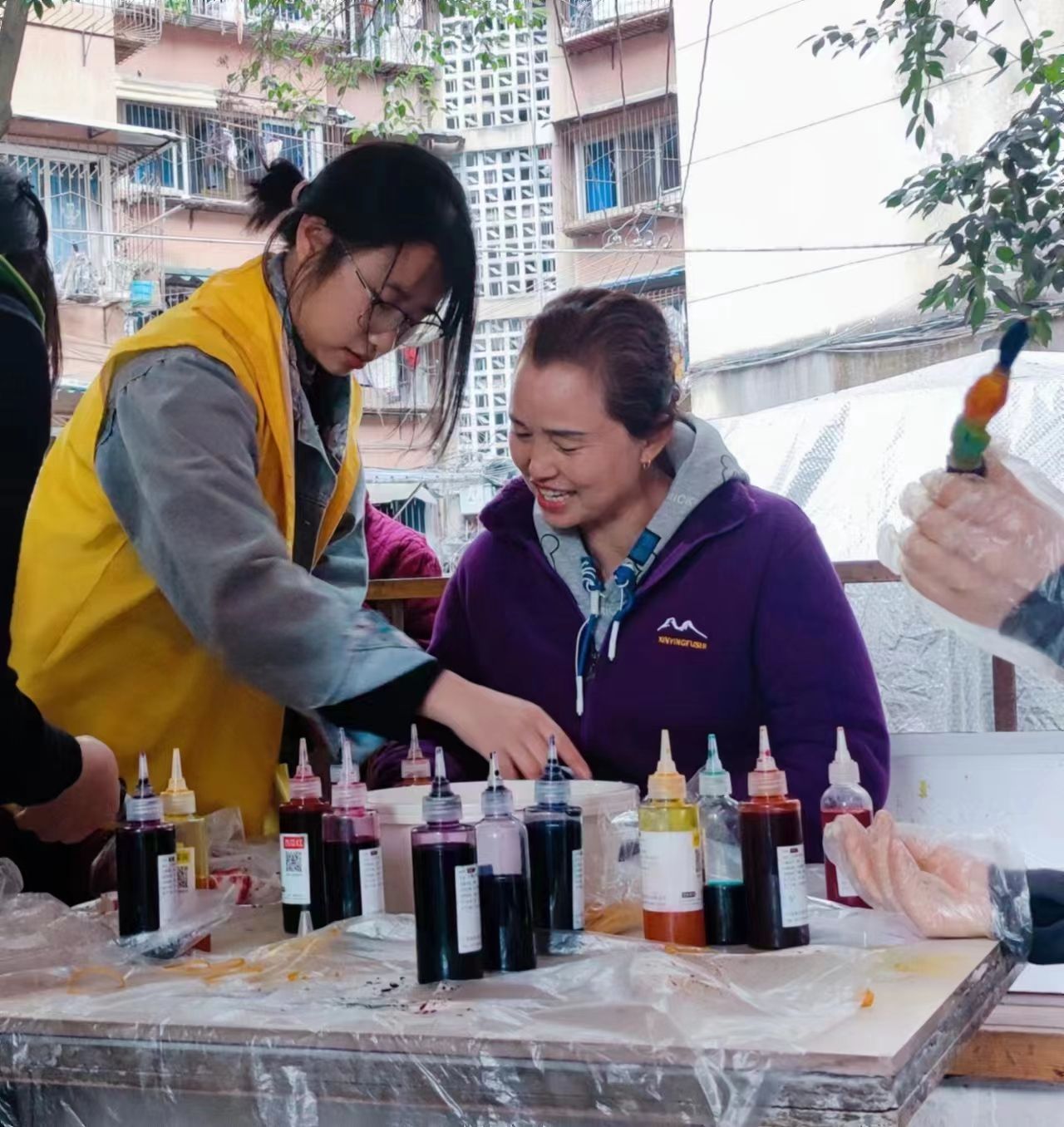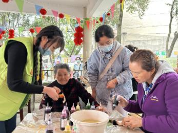 活动进行过程中,居民对于扎染体验抱有较高的积极性,大胆尝试不同的色彩搭配与扎染样式。