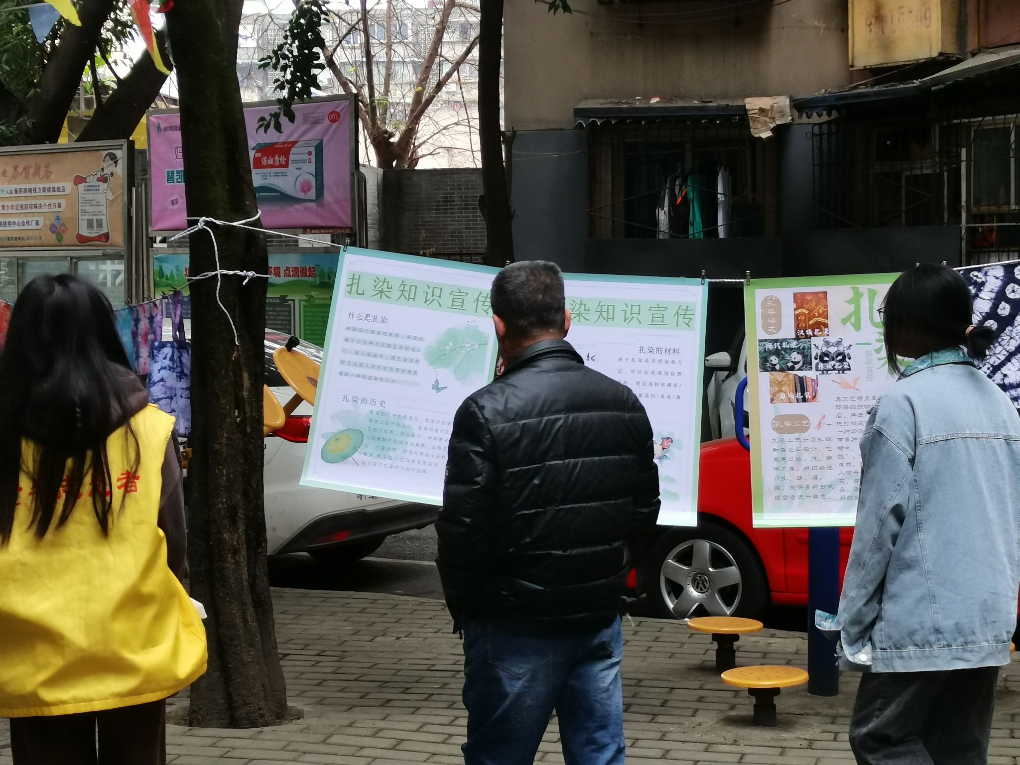扎染主题科普活动过程中,我们通过展览,通过对扎染作品的展示来吸引社区居民的目光;讲解,通过扎染科普海报的制作张贴以及现场讲解使社区居民能够对扎染手工艺有一个初步的了解与认识;体验,通过和开设扎染体验摊点让社区居民进行扎染初体验,引起居民的兴趣。