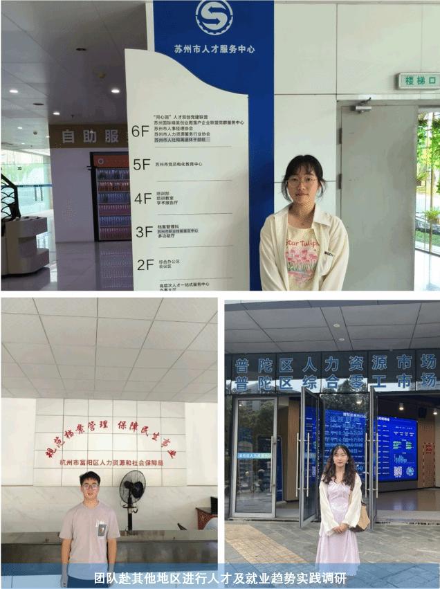 除诸暨市人社局和诸暨本土企业之外,为多方位对比了解,实践队成员还调研了其他地区人才及就业趋势,赴宁波市普陀区人力资源市场、杭州市富阳区人力资源和社会保障局、苏州市人才服务中心,从多方面了解由政府牵头,企业支持,求职者热情参与的求职市场,这也为我们提供了就业方面的重要资讯。