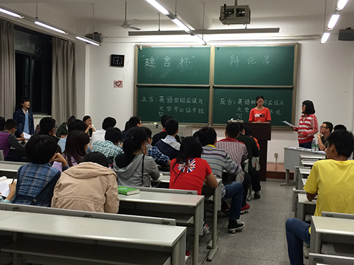 在x8539举行了 “建言杯”辩论赛。此次辩论赛的两个主题都较为贴近大学生活,一是“英语四级是否应该与大学毕业证挂钩”,二是“高校是否应该对社会人员开放”。今日赛程的比赛分组为建筑一班对阵建筑三班,建筑二班对阵风景园林。除了来自卡通a片