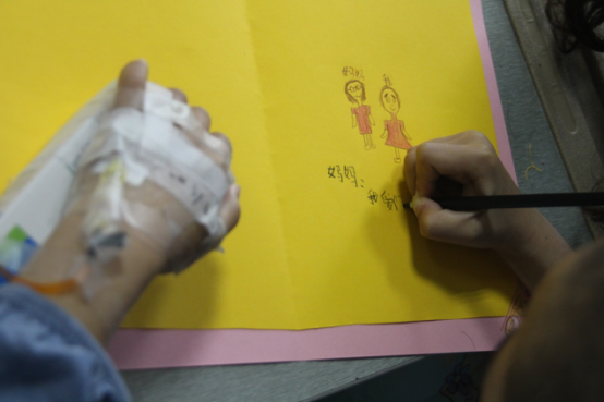 一张名为“你是我的全世界”的贺卡深深感动了志愿者和在场的医护人员。贺卡写道:“在化疗的过程中,我脾气可能会不好,因为我实在无法忍受化疗的痛苦和复发给我的打击。但我知道,为了我你已经付出一切。”简单两句话表达出孩子们治疗过程虽痛苦,但是他们仍心怀感激,憧憬着未来。
