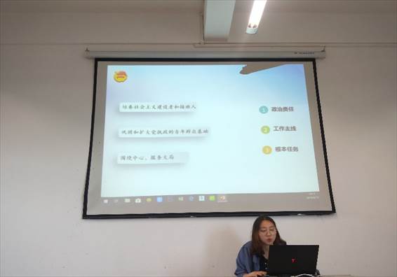 第二项流程,团支部书记章蕊玺为大家解读了《重学团章团史做新时代合格团员》的内容,在解读过程中,同学们共同了解了共青团的性质与职能,对团支部工作有了深刻的认识。随后团支部书记章蕊玺带领同学们观看了《四川省中长期青年发展规划》,这部为青年量身打造的《规划》方方面面在青年发展方向提出明确可行的方法,使同学们迅速认清自己的定位,确立自己的方向。