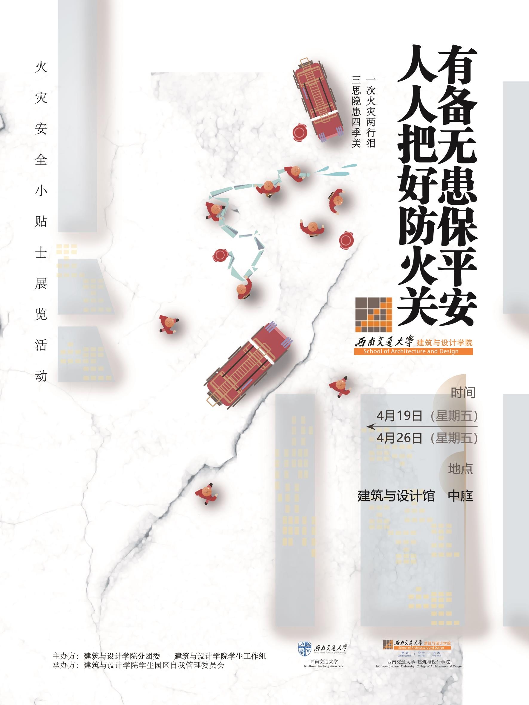 2019年4月25日,由建筑与设计学院学工组和建筑与设计学院分团委主办,建筑与设计学院园区自我管理委员会承办的“人人把好防火关,有备无患保平安”火灾安全小贴士展览活动于建筑与设计学院一楼中庭正式开展