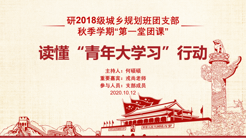 建筑与设计学院研2018级城乡规划班团支部在线上开展了以“读懂‘青年大学习’行动”为主题的“秋季第一堂团课”活动,由团支部书记何硕硕同志主持,辅导员戎尚老师参与本次团课。