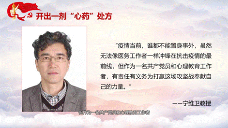 第二,率先垂范,在心理战疫中发挥党员先锋模范和党组织战斗堡垒的作用。习近平总书记指出在关键时刻冲得上去、在危难关头豁得出来,才是真正的中国共产党人。宁维卫教授在抗疫中,积极组织老师,很快做出了相应的心理防疫手册,同时在抗疫过程中不忘脱贫攻坚,奔波在抗疫和扶贫的第一线,为抗疫、扶贫送出了一剂心药良方;卡通a片