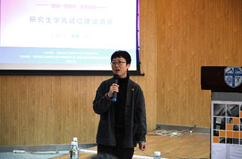 建筑与设计学院研究生会于4月14日14时在八号教学楼300学术报告厅顺利开展“研究生学风诚信建设讲座”,讲座由学院建筑系副教授熊瑛老师主讲,学院研会指导老师杨珂主持,学院执行院长沈中伟老师、党委副书记刘一杰老师、团委书记孔翔榆老师、研究生辅导员戎尚老师、成飞老师及全校近两百名同学参加了本次活动。