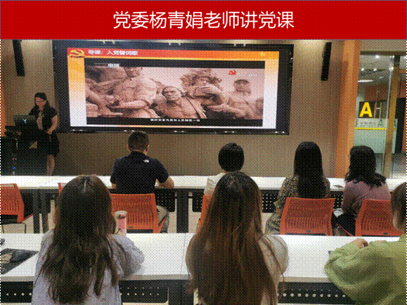 首先,杨青娟老师带领大家重温入党誓词,牢记初心使命。第二部分,杨老师以“开天辟地”、“改天换地”、“翻天覆地”、“惊天动地”四个关键词介绍了中国共产党的发展史,并结合自身学习《毛泽东选集》的心得体会,阐述了中国共产党的先进性。随后,杨青娟老师以纪录片《朝鲜战争》中的片段,生动介绍了中国共产党不畏艰难,百折不挠的崇高精神。最后,杨老师结合疫情期间的感人案例和《那兔那鹰那国》的文艺作品,阐述了对“中国共产党因何而伟大”这一问题的理解。