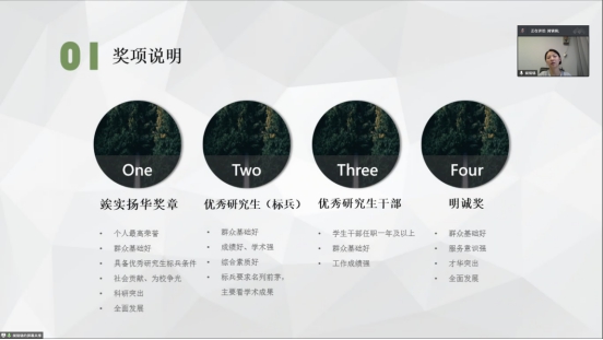 首先,杨珂老师对竢实扬华奖章、优秀研究生、优秀研究生干部和明诚奖等奖项向同学们进行了逐一介绍,并对各个奖项的评选条件作了相应说明,特别强调了申请人需拥护中国共产党的领导、无纪律处分、专业成绩优异等前提。随后,杨珂老师介绍了2019级各个研究生班级的荣誉称号名额分配情况,对优秀研究生标兵的评选方式做了相应解释,并鼓励大家踊跃申报竢实扬华奖章。