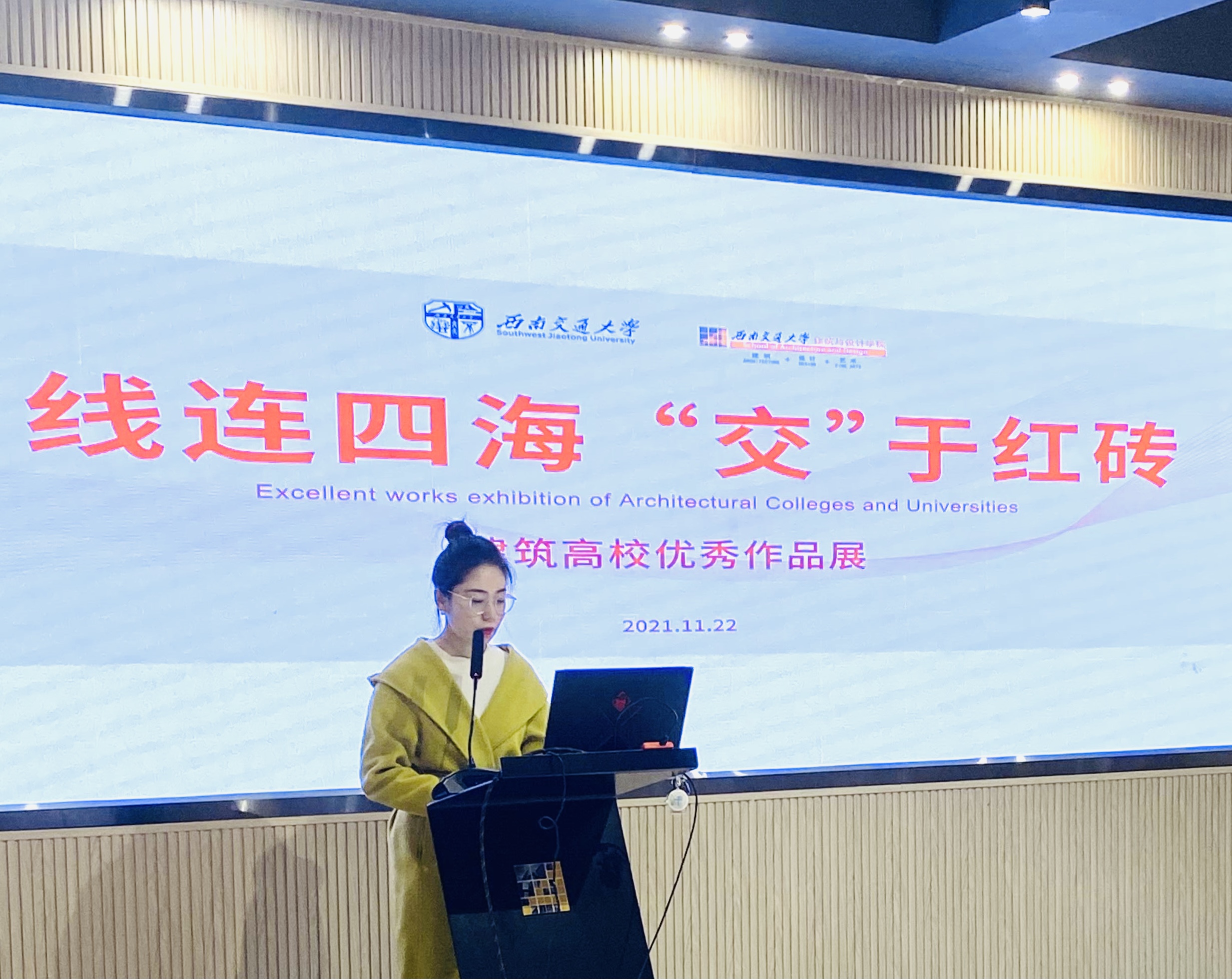 建筑与设计学院团委书记孔翔榆老师上台致辞。发言中,她对长期以来合作的各大建筑高校以及筹备本次展览的工作人员致谢,也对新加入的高校表示欢迎。孔翔榆书记谈到,今年是高校作品联展走过的第七年,在响应国家疫情防控号召的同时,建筑与设计学院也不断探索新的交流方式,创造更多思维碰撞与学术交流的形式,让来自五湖四海的同学们感受交大百年历史传承和“竢实扬华 自强不息”的交大精神。