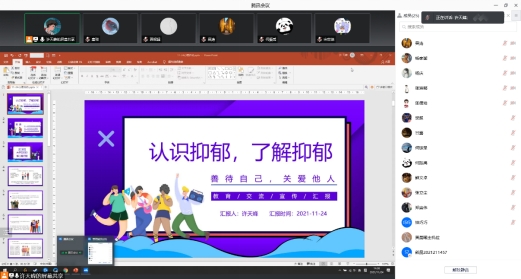 为了普及心理知识,营造班级良好氛围。2021年11月24日下午2:30建筑与设计学院2021级建筑专硕1班因受疫情影响,通过腾讯会议采用线上举办主题班会活动。同时为响应学校心理中心和学工部的号召,一场旨在了解研究生的心理变化,做好研究生心理健康教育工作,同时为了引导号召大家关注自身健康,正视自身问题,开展“认识抑郁、了解抑郁,善待自己、关爱他人”主题活动。