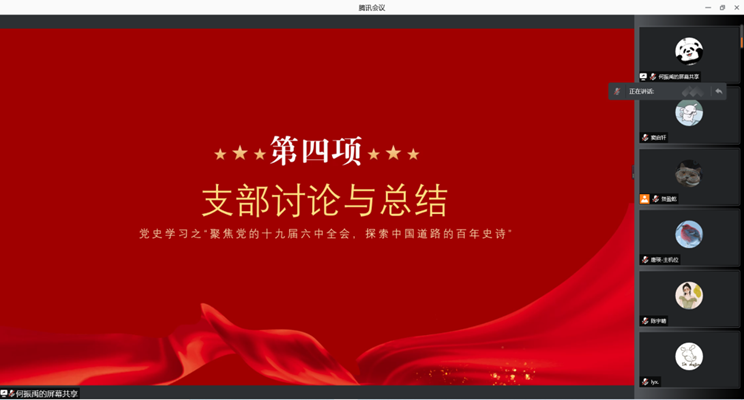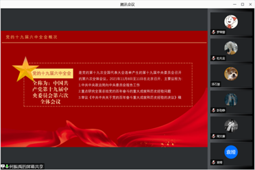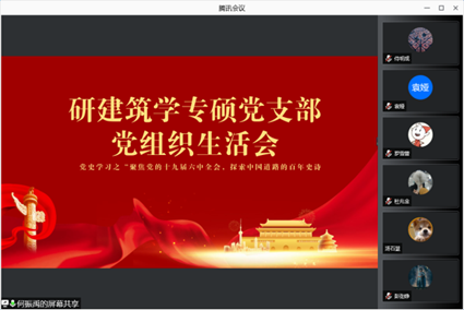 研建筑学专硕党支部于腾讯会议线上召开 “聚焦党的十九届六中全会,探索中国道路的百年史诗”主题组织生活会,支部全体党员及入党积极分子参加了本次会议。本次会议由何振禹同志主持。