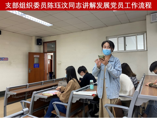 随后,党支部组织委员陈珏汶同志根据《中国共产党发展党员工作细则》、《中国共产党发展党员工作流程图》规定等相关内容,讲解了入党申请人初步培养阶段、入党积极分子的确定和培养、发展对象的确定和考察、预备党员的接收、培养教育、考察和转正等中国共产党发展党员的“5个阶段”、“25个步骤”作了详细的讲解。