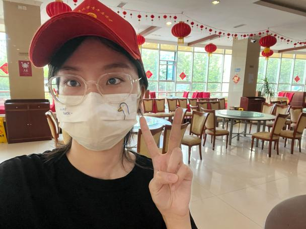 2022级本科新生张甜芮、葛琎、刘昕羽、龚主行、袁欣蕾、刘泉彤、曹见晴等同学在志愿者组织的号召下,分别在学校各个食堂担任食堂志愿者,劝导学生遵守疫情防控要求。